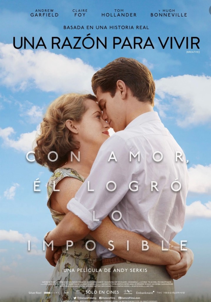 «Una razón para vivir» es una película del 2017 dirigida por el hasta entonces actor Andy Serkis. Está protagonizada por Andrew Garfield en el papel del enfermo Robin y por Claire Foy como su esposa Diana, y ambos hacen un trabajo bastante bueno. Su título original es «Breathe», que significa respirar, muy adecuado como veréis.